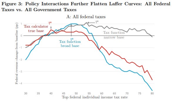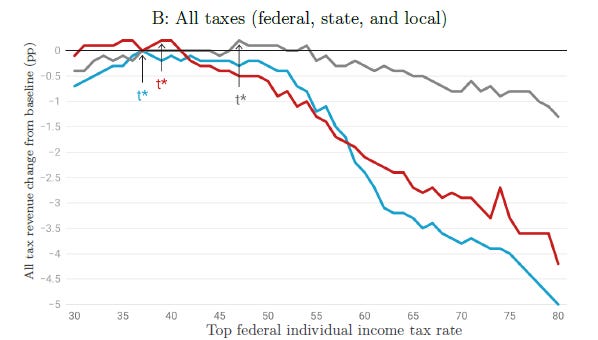 They find that overall federal tax revenues only increase by 0.5% when the top federal income tax rate increases from 37% to 40%, and that it plateaus after that before eventually yielding consistent revenue reductions on the other side of the curve.