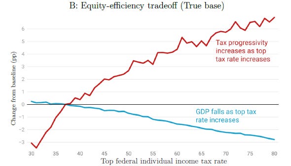 The authors identify an equity-efficiency trade-off in which GDP falls while tax progressivity increases, noting that over the flat region, “increasing the top rate raises relatively little revenue,” whereas “raising top rates primarily trades off between progressivity and growth.”